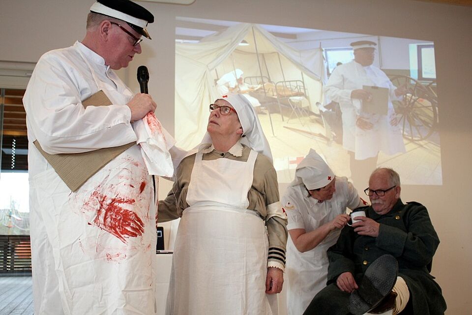 Harry van Oest stand im blutigen Kittel vor den Gästen des Zülpicher DRK-Neujahrsempfanges im Seehaus und erklärte, dass der an Krücken gehende Capitaine Robert eine Schusswunde am Bein habe, das man vermutlich amputieren müsse. Die beiden Schwestern kümmerten sich rührend um den französischen Soldaten, der mangels Sprachkenntnis nicht wusste, was auf ihn zukommt. Van Oest sagte am Ende der kurzen Aufführung, dass sich bis heute Vieles verändert habe. „Aber eines ist gleich geblieben: Wir gehen in den Einsatz, um zu helfen – egal, was kommt.“