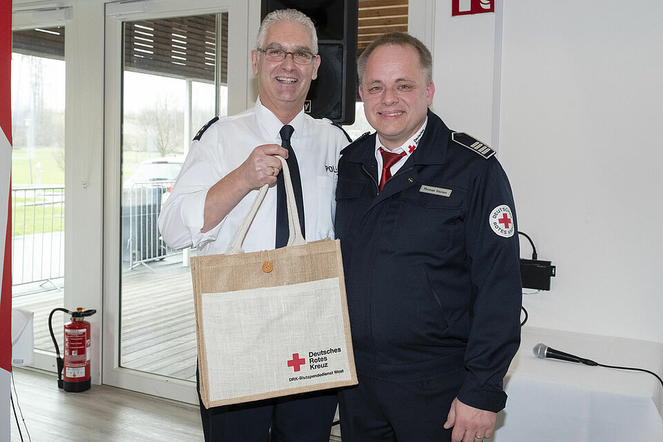 Dieser Freundschaft geht auch noch weiter. Das betonte Thomas Heinen, insbesondere in Richtung Feuerwehr, Polizei und Ordnungsamt in der Stadt Zülpich, die erneut zum Jahresempfang eingeladen und gerne gekommen waren. Besonders bedankten sich Heinen und die Rotkreuz-Familie bei Dietmar Dusend vom Bezirksdienst der Polizei, der zum Ende des Jahres in den Ruhestand geht. „Du hast immer ein offenes Ohr für uns und wir danken Dir für die gute Zusammenarbeit“, so Heinen, der an diesem Vormittag auch selbst ausgezeichnet werden sollte und ein großes Dankeschön erfuhr.