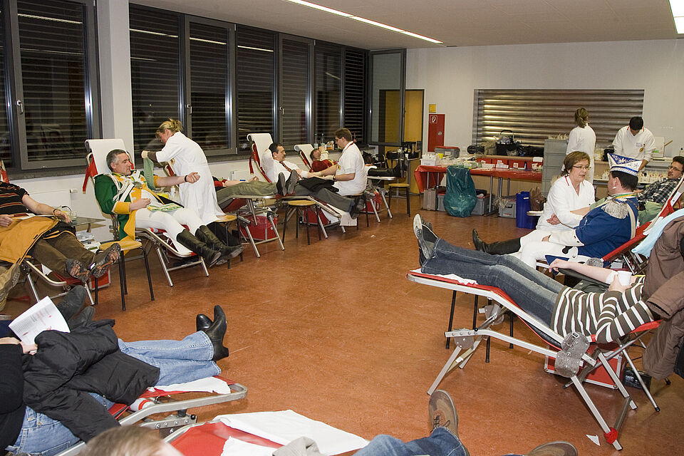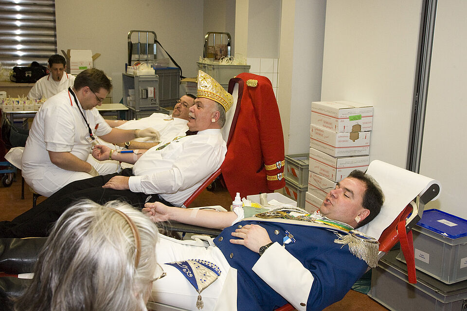 Günter Esser, der Präsident der „Zölleche Öllege“, meinte angesichts der vielen uniformierten Karnevalisten: „Das ist wie ein Treffen unter Freunden.“ In rekordverdächtiger Zeit stand Prinz Markus wieder von der Spenderliege auf: Nach nur fünf Minuten und 43 Sekunden war der lebensrettende halbe Liter Blut, der jedem Spender abgenommen wrd, fachgerecht „eingetütet“.