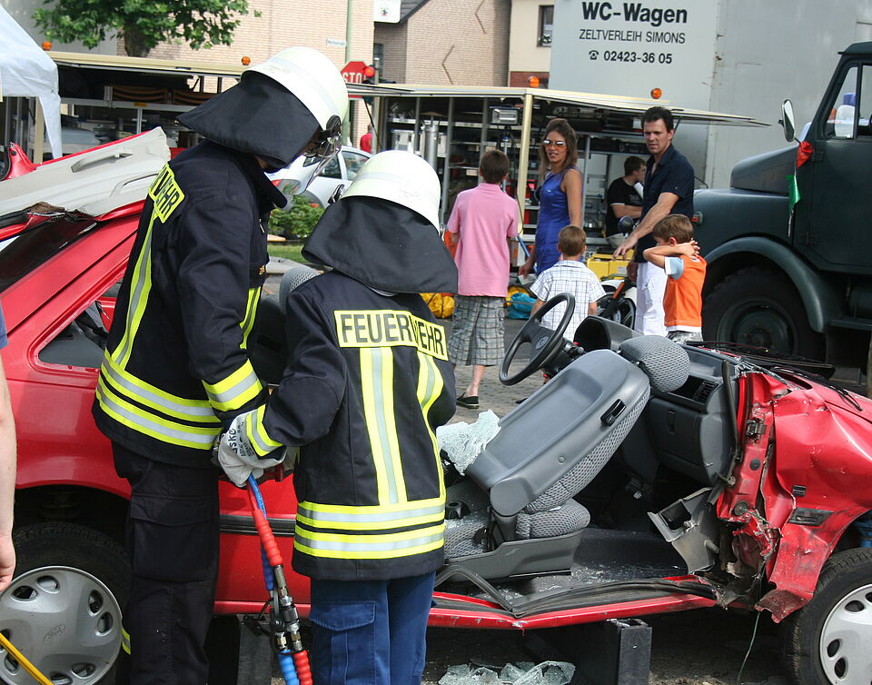 Die Freiwillige Feuerwehr ließ für manchen den Traum vom Feuerwehrmann lebendig werden: Interessierte Besucher konnten in die robuste Schutzkleidung steigen und durften sich auch einmal mit der Hydraulikschere an einem Schrottauto versuchen.