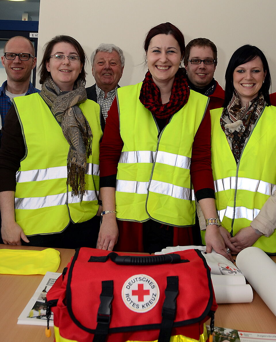 Den Bereitschaftskoffer mit Verbandsmaterial und Ausrüstung, Sweatshirts mit Schulsanitätsdienst-Symbolen und Warnwesten überreichte Simon Jägersküpper, der zuständige Mann vom Rotkreuz-Kreisverband. Mit von der Partie waren auch Lothar Henrich, der Vorsitzende des Rotkreuz-Ortsverbandes Zülpich, der im September 2013 sein hundertjähriges Bestehen feiert.
