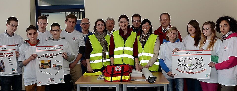 Benedikt Ziemons, Pierre Spang, Jörn Wachendorf, Alicia De Sousa, Maurice Stutte, Mike Waser, Christina Weiß, Saskia Eder und Nina Wiens nahmen stellvertretend für alle 14 neuen Zülpicher Schulsanis Ausrüstung und Sanmaterial entgegen. An der Hauptschule Zülpich hatte es bereits in der Vergangenheit einen Schulsanitätsdienst gegeben – die Lehrerinnen und Schüler um Heide Winkelmann wiederbeklebten ihn zu Schuljahresbeginn.