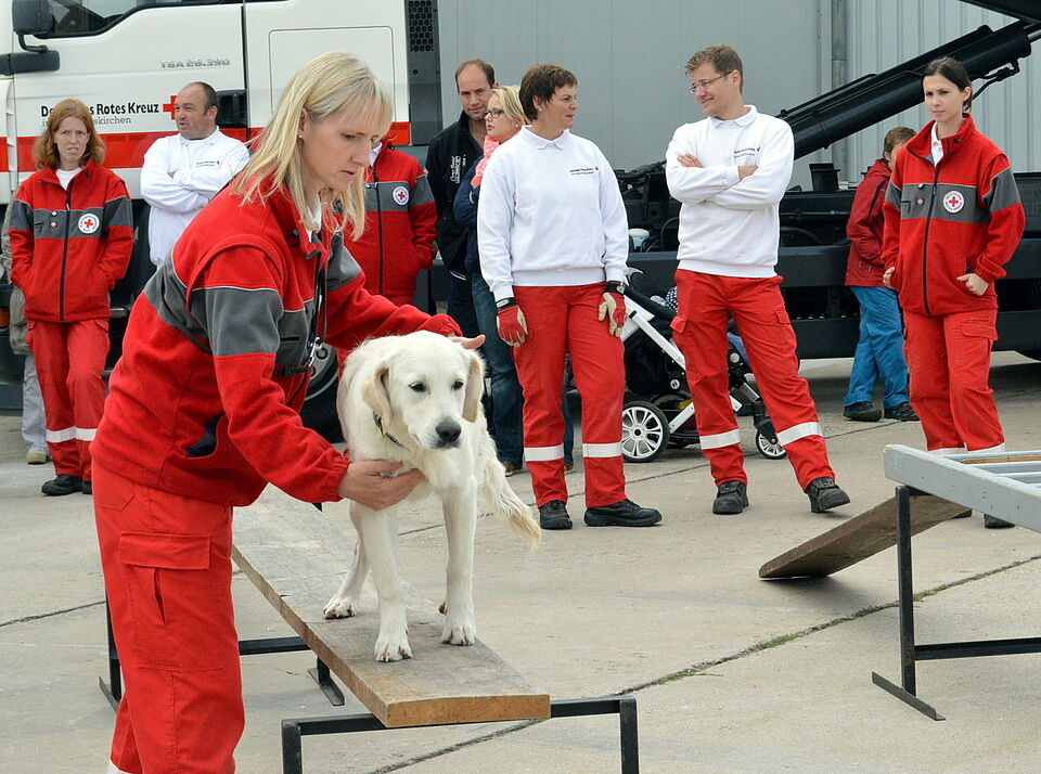 Ein starkes Team, das sein Können bereits bei zahlreichen Einsätzen erfolgreichen bewiesen hat, sind Monika Artz und ihr Vermisstensuchhund, der Springer Spaniel „Tristan“. In Zülpich konnten die Schaulustigen ihn und die weiteren Zwei- und Vierbeiner der von Franz Küpper geleiteten Rotkreuz-Rettungshundestaffel beim Training beobachten. Dabei balancierten die in Flächen- und Trümmersuche ausgebildeten Hunde über Bretter, Leitersprossen und Wippen. Für Kinder hatte die Zülpicher Gemeinschaft viele Spielmöglichkeiten im Angebot, von Turmbau mit „Karlo Klötzchen“ über einen auf Stelzen laufenden Ballonkünstler bis hin zur Hüpfburg. Auf schwindelfreie Kletterer wartete das Kistenstapeln. Dabei schafften es manche Kletterer, gut gesichert mit Helm, Gurt und Krahn, bis in luftige Höhen.