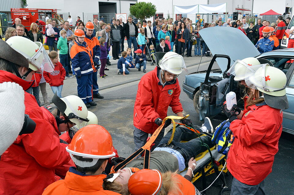 In Scharen zog ein realistisch nachgestellter Autounfall die Zuschauer an. Dabei stellten die Nachwuchshelfer des Jugendrotkreuzes unter Anleitung von Ausbilder Timo Prinz gemeinsam mit der Jugendfeuerwehr unter Beweis, dass auch sie im Ernstfall wissen, was zu tun ist. Auch bei der Einsatzübung der erwachsenen Rotkreuzler konnten diese sich auf die Unterstützung der Freiwilligen Feuerwehr Zülpich verlassen.