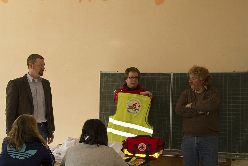 Der Jugendrotkreuz-Kreisreferent Simon Jägersküpper stattete die Schüler und ihren Betreuungslehrer Herr Berg mit T-Shirts, Warnwesten, einer prallgefüllten Sanitätstasche und Postern für den Sanitätsraum aus. Diesen haben die Schüler bereits neu gestrichen und das Schulsanitätsdienstlogo unübersehbar an die Wand gemalt. Zur Weiterbildung erhielt der Lehrer auch noch ein Paket mit allerhand Informationen und Lehrunterlagen zur Ersten Hilfe und zum Jugendrotkreuz.