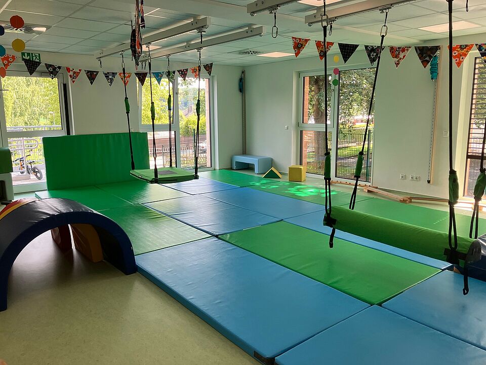 Die Kinder können täglich unseren großen Bewegungsraum nutzen. Ein attraktives, vielfältiges Außengelände umschließt das Haus und lädt Kinder zu naturnahem Spielen und Erleben ein. Hier gibt es Weidentunnel und – Zelte, einen riesigen Sandkasten, einen Wasserspielplatz und eine große Matschküche sowie ein Blumen, Kräuter und Gemüsebeet.