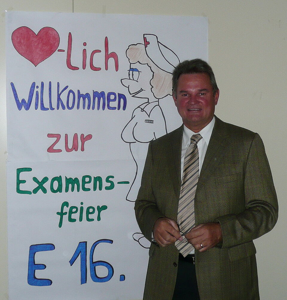 "Wenn alles gut geht, wird ein jeder von uns in die Phase eintreten, die als Altsein verstanden wird. Viele der heutigen Seniorinnen und Senioren sind fit und unternehmenslustig, sie wissen aus ihrem Rentnerdasein viel zu machen.Doch wir müssen auch sehen, dass mit zunehmendem Alter die Wahrscheinlichkeit wächst, gebrechlich zu werden und auf Unterstützung angewiesen zu sein. Für diese Menschen, liebe Absolventinnen und Absolventen des Lehrgangs E16, wollen Sie da sein.Sie wollen sich an den unterschiedlichen Vorstellungen und Bedürfnissen dieser Seniorinnen und Senioren orientieren, was ich sehr begrüße.Sie haben sich ein Berufsfeld ausgesucht, welches eindeutig im Zeichen der Menschlichkeit steht.Deshalb kann ich Sie zu Ihrem Entschluss, den Lehrgang E16 des Fachseminars für Altenpflege zu belegen, nur beglückwünschen.