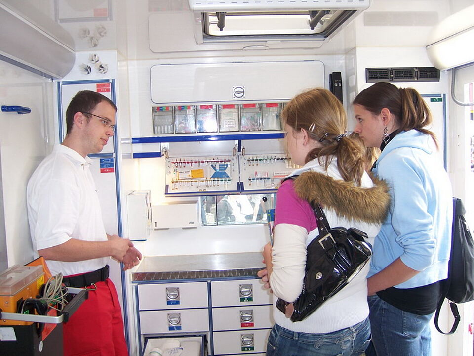 Bild DRK-EU | Nach einer kurzen Erklärung geht es dann in den Rettungswagen. Hier stehen dem Rettungsteam im Einsatz viele technische Geräte und Hilfsmittel zur Verfügung. Berufswunsch Rettungsdienst; da ist viel technisches Verständnis, aber auch soziale Kompetenz und Engagement gefordert.