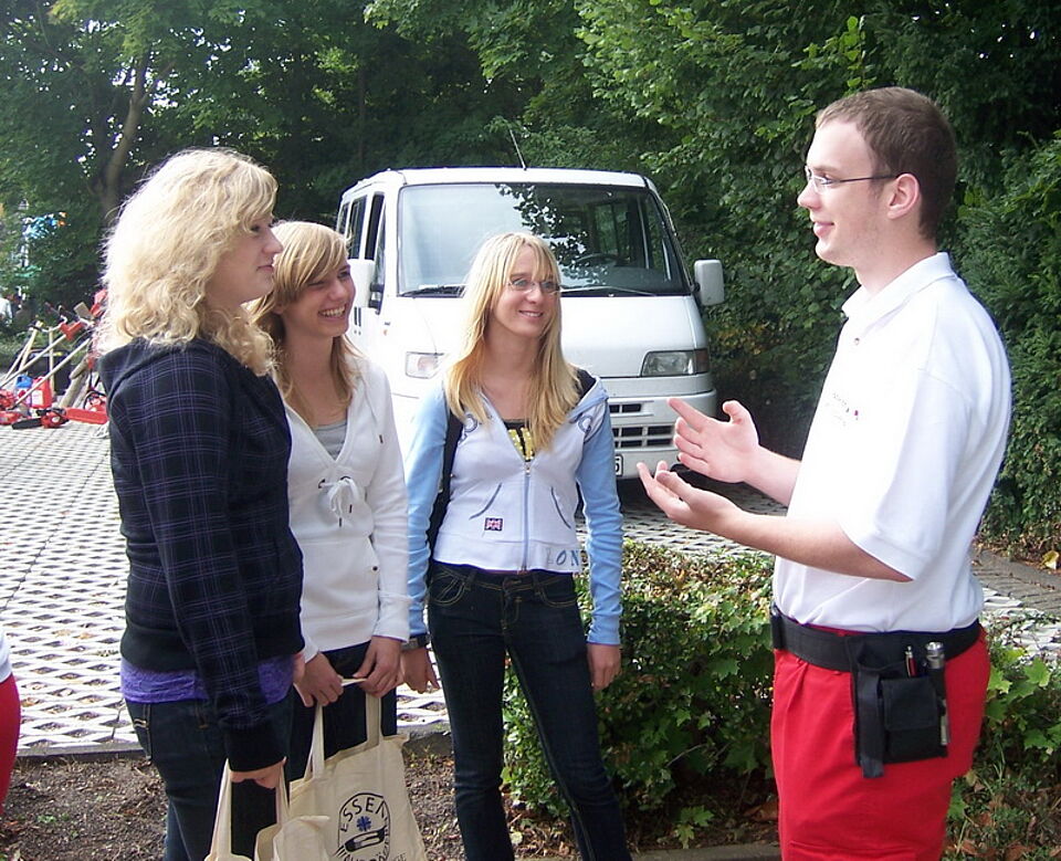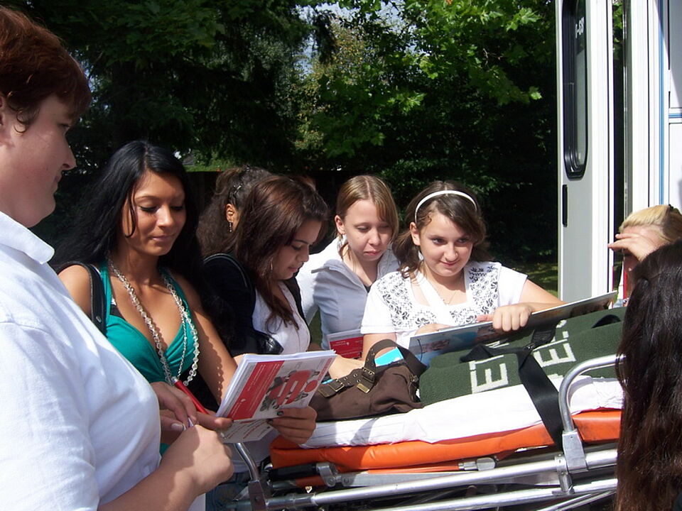 Bild DRK-EU | Ihr Kollege Marc Zietsch, Rettungsassistent in Ausbildung, steht einigen jungen Damen mit Informationen zur Verfügung .