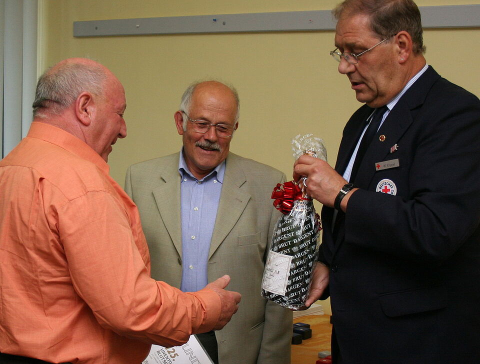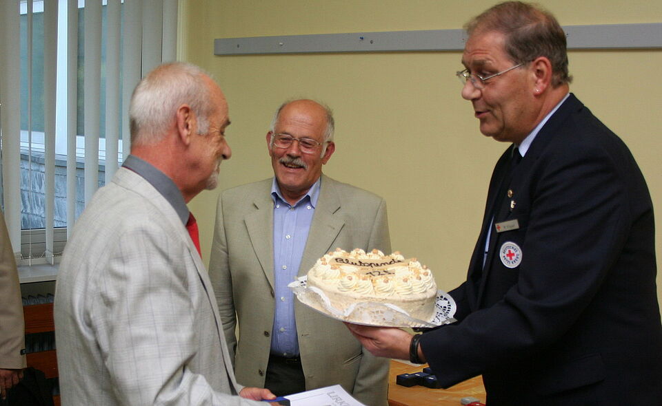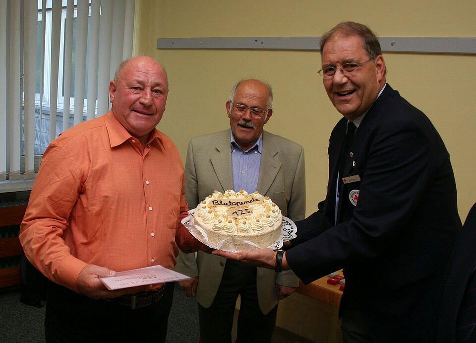Dieses Jahr gab es für den Rotkreuz-Ortsverein sogar drei Spender zu ehren, die bereits 125 Mal zur Blutspende gingen. Dies waren Ludger Weer, Peter Schmaul und Dieter Hülsewede. Sie erhielten als besonderen Dank einen Kuchen mit der Marzipan-Aufschrift "Blutspende 125. Mal" sowie eine Flasche Sekt.