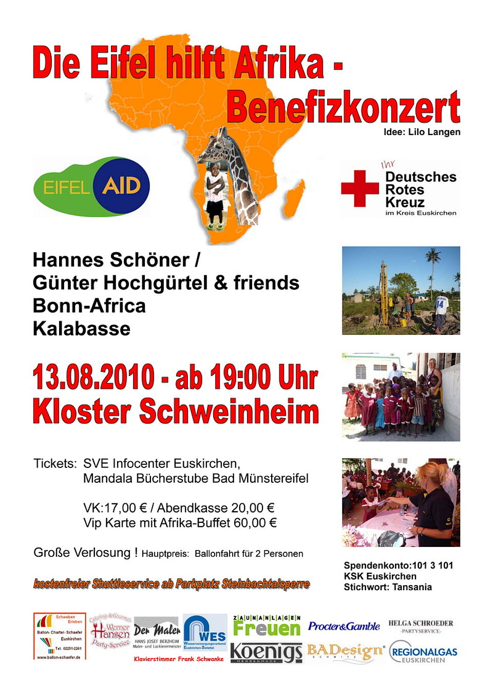 Und so will Günter Hochgürtel, Eifel-Troubadour und Wibbelstetz-Frontmann, zusammen mit Hannes Schöner, Bassist bei „Höhner“, „Pianomann“ Gero Körner und weiteren Musikern am Freitag, 13. August, ab 19 Uhr im Kloster Schweinheim (Nähe Steinbachtalsperre) für die hilfebedürftigen Menschen in Tansania konzertieren. Außerdem treten die Trommelgruppe „Kalabasse“ und die afrikanische Band „Bonn-Africa“ auf.