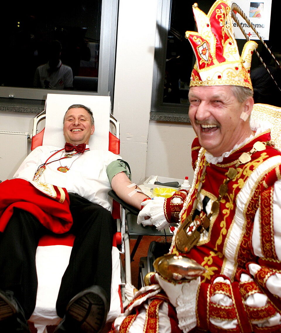 Bild DRK | Auch ehemalige Prinzen spenden Blut: Seine Tollität Prinz Jürgen I. von Zülpich steht seinem Vorgänger bei der Spende bei, da er selbst leider aus gesundheitlichen Gründen nicht spenden konnte. Seinem Aufruf zur Spende in Zülpich waren mehr als 270 Blutspender gefolgt.
