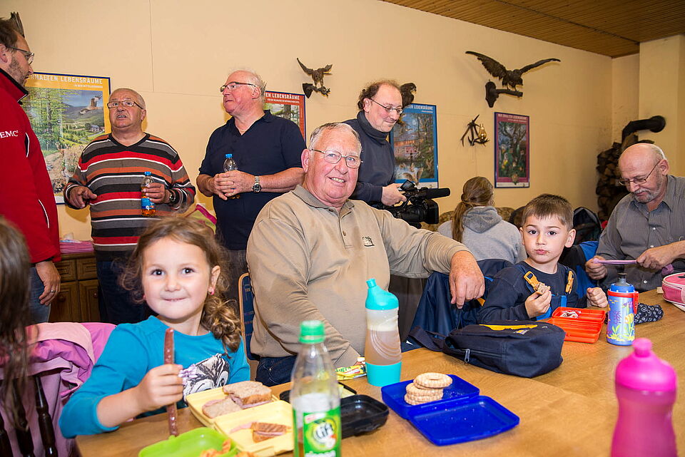 Bild DRK EU DD | vogelsang ip - Das Jugend-, Natur- und Umwelthaus „Transit 59“ bot den von Herhahn aus wandernden Großvätern und Kindern Zuflucht vor dem Regen. Die Wanderung war eine von mehreren Aktionen im Projekt „Die neuen Opas“, bei dem untersucht werden soll, wie sich die Beziehung zwischen Enkeln und Großvätern zur Zeit darstellt.