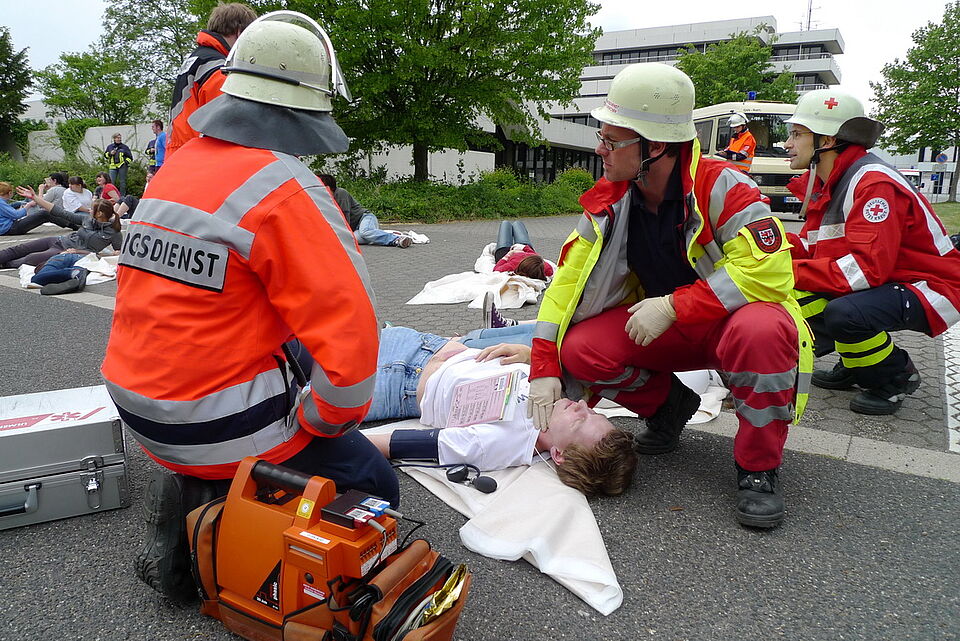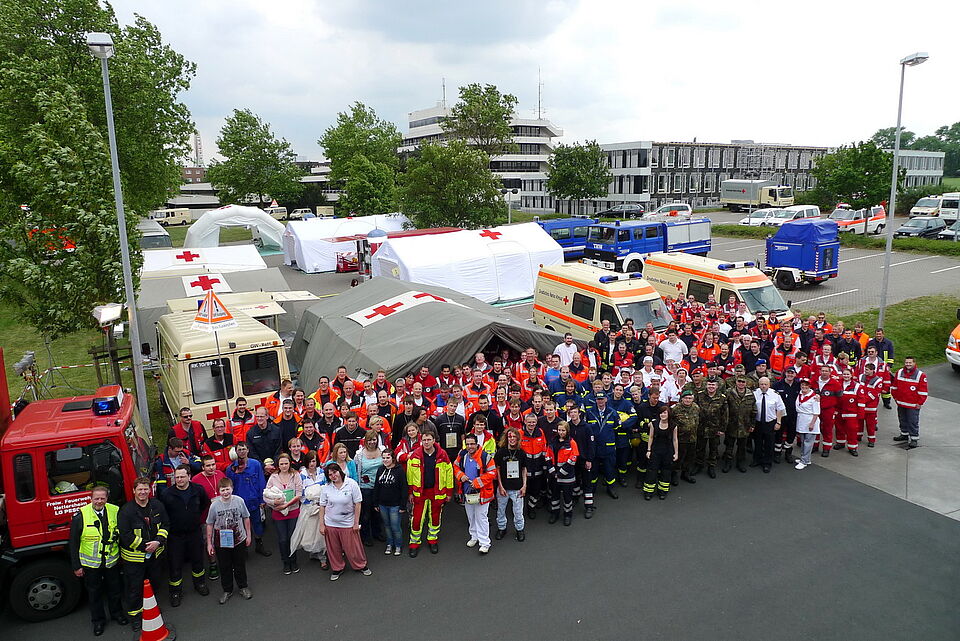 Bild DRK | Für die "LNA-Übung" wurde von vielen Mimen das Szenario "Kollision von zwei PKW mit einem Linienbus" gestellt. Knapp 60 Verletzte stellen eine große logistische Herausforderung dar, die von den teilnehmenden Organisationen aber gut gemeistert wurde.