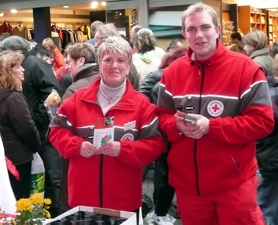 Bild DRK ZR | Edeltraud Engelen und Daniel Hermanns informieren über die Arbeit des Euskirchener Roten Kreuzes beim Knollenfest in der Fußgängerzone.