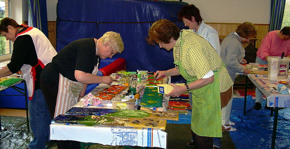 Um dieses Ziel zu erreichen, habe sie gezielt Farben, kunsttherapeutische Methoden und Musik eingesetzt. „Die Frauen sollten einfach den Kopf abschalten und sich leiten lassen“, erklärt Claudia Simmler. Am Ende des vierwöchigen Kurses sei nicht nur sie, sondern auch die Teilnehmerinnen von den Ergebnissen überrascht gewesen. Beeindruckt zeigten sich am Samstag auch die Besucher der Ausstellung im Malsbendener Rot-Kreuz-Kindergarten. Neben den meist warmen Farbtönen fielen dabei auch die unterschiedlichen Herstellungstechniken der Kursteilnehmerinnen ins Auge. So gab es unter anderem Kleisterbilder und Drucke zu sehen.