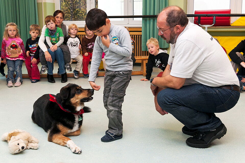 Spielerisch lernten die Kinder während des Besuchs, dass Hunde vor allem wegen ihres überragenden Riechorgans für den Menschen so wichtig sind. Praktische Tipps, etwa wie man sich einem Hund nähert („Niemals von hinten.“) rundeten den Besuch Lenas ab. Auch lernten die Kindergartenkinder, wie man einen Hund füttert. Hierbei bewies Lena den richtigen Spürsinn und fand alle in den Händen der Kinder versteckten Hundekekse.