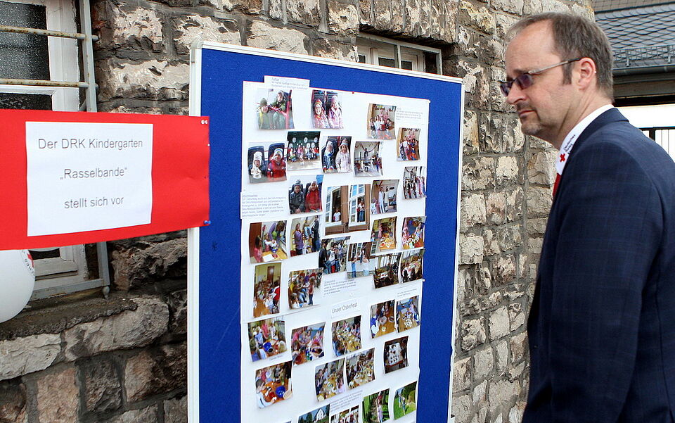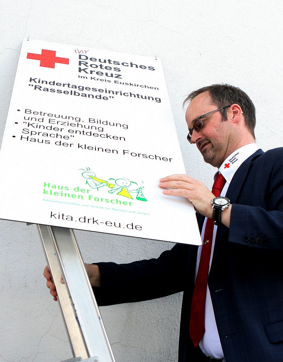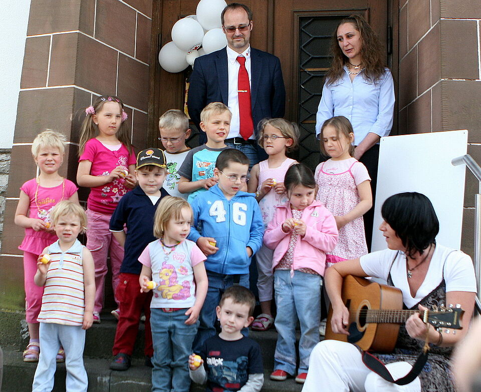 Blankenheimerdorf – Nomen et Omen: „Rasselbande“ heißt ab sofort die Kindertagesstätte in Blankenheimerdorf in Trägerschaft des Roten Kreuzes. Bei herrlichem Frühlingswetter empfingen die 21 Kinder Orts-vorsteherin Tanja Möllengraf und den Geschäftsführer Soziale Dienste des Roten Kreuzes im Kreis Euskirchen, Rolf Klöcker, zur feierlichen Namensgebung mit einem eigens für diesen Anlass einstudierten Lied auf der Treppe des Hortes.