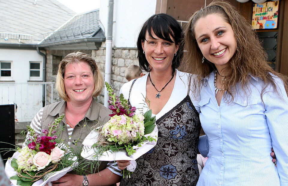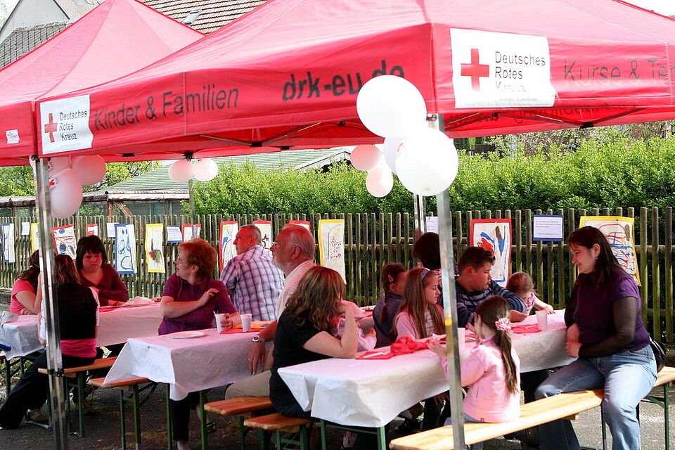 Im Anschluss an den formellen Teil der Feier luden die Kinder und ihre Erzieherinnen – diese sind außer Anja Leitner auch noch Sylvia Scheuren und Valerie Scholz - die Gäste zum großen Kindergartenfest in den Hof der Tagesstätte ein. Den Besucherandrang an diesem Tag nutzte man außerdem dazu, die Kunstausstellung unter dem Motto „Überall sind Farben“ zu präsentieren. Im Laufe dieser Projektarbeit waren rund 80 Bilder gemalt worden, die auch zum Verkauf angeboten wurden. „Wir haben den Kindern die verschiedenen Maltechniken erklär. Dabei sind so viele Kunstwerke entstanden“, so Leiterin Anja Leitner zur Menge der Bilder. Neben freier Technik übten sich die kleinen Künstler auch im Anfertigen von Murmelbildern, Kartoffeldruck, Pustetechnik sowie Klatsch-, Zauber- und Schleuderbildern.