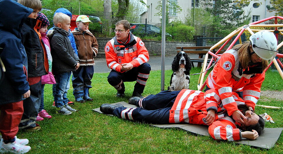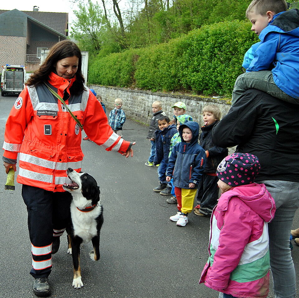 „Faszination Rettungshund“ heißt das speziell für Kindergärten entwickelte Angebot. „Dabei lernen die Kinder die Arbeit mit den Rettungshunden und eine der vielen Aufgaben des DRK kennen. Gleichzeitig ermöglicht es vor allem den Kindern, die keinen Bezug oder gar Angst haben, den Zugang zum Lebewesen Hund“, erklärte Franz Küpper. Das zeigte sich auch beim Besuch seiner Truppe im Blankenheimer Rotkreuzhaus. Denn da ging das Team besonders einfühlsam auf die Kinder ein, denen die Vierbeiner nicht ganz geheuer waren. Mit Erfolg: Anschließend trauten sie sich sogar, den Hunden zur Belohnung das Spielzeug zu werfen oder sich auf dem Außengelände der Kindertagesstätte suchen zu lassen.