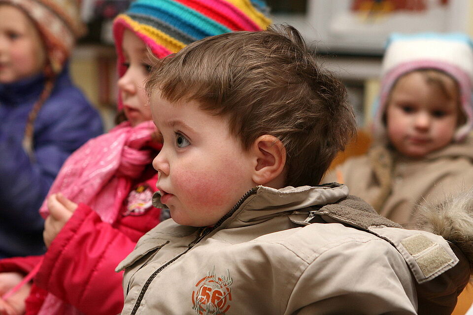 Erzieherin Gabi Möhlendick zog mit ihrer Geschichte vom „Stern Glitzi“ die Kinder in ihren Bann. Gegen den Hunger gab es frische Waffeln und Stockbrot, Glühwein und Kinderpunsch wärmten von innen. Nicht nur die Kinder, Eltern und Großeltern waren gekommen, auch viele Freunde und Anwohner der Rotkreuz-Kindertagesstätte besuchten das Fest. So saßen auch Ludger Schneider und Wilfried Meyers beim Glühwein zusammen. Beide sind seit Jahrzehnten als Nikolaus und Hans Muff in Blankenheimerdorf unterwegs.