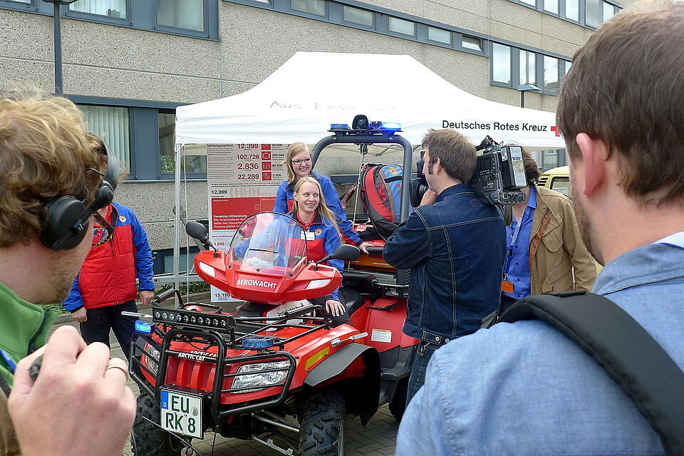 Außerdem hatte der Aufbautrupp um Daniel Hermanns und Rolf Zimmermann den erwähnten „Arctic Cat“ an der Rotkreuzstation im Innenhof des BBK aufgebaut. Mit dem Gefährt sind die Helfer im Winter im Ski- und Rodelgebiet rund um Udenbreth, im Sommer im Nationalpark Eifel von der Rettungswache Vogelsang aus im Einsatz. Außerdem ein Hochwasser-Einsatzboot der Rotkreuz-Wasserwacht und einen historischen Behelfskrankenwagen „T 2“ aus dem Jahre 1974, der sich im Privatbesitz von Daniel Hermanns aus Euskirchen befindet.