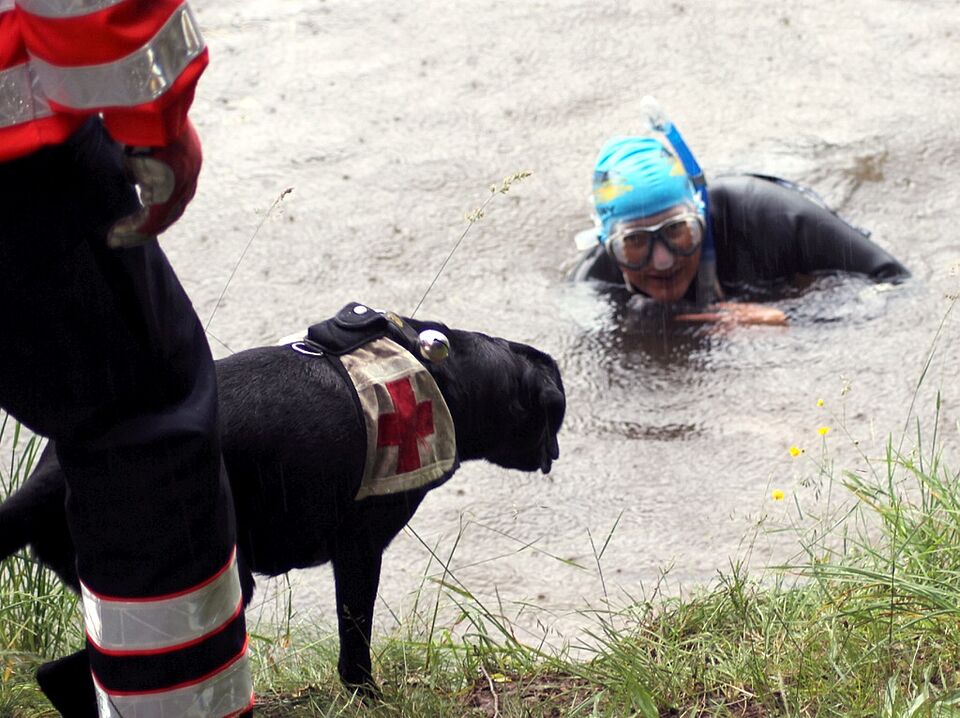 Wald- und Wiesengelände durchstreifen die Hunde – und sogar mehr. Denn für die Übung hatten sich die Verantwortlichen auch eine schwere Aufgabe einfallen lassen. Eine Taucherin lag im Neoprenanzug nahe dem Ufer im Wasser. Um auf dem Wasser zu suchen, benötigen die Tiere eine spezielle Ausbildung zum Flächensuchhund. „Die Hunde benötigen immer Wasser unter den Pfoten. Eine Suche vom Boot aus geht nicht“, sagte Artz. Schon nach kurzer Zeit zeigte der erste Vierbeiner durch lautes Bellen an, dass er die Taucherin, die „leblos“ im Wasser lag, gefunden hatte. Der Hundeführer meldete den Fund an den Einsatzleitwagen. „Die Übung war wichtig. Für alle. Und sie hat gute Erkenntnisse gebracht. Ohne üben geht es nicht“, waren sich die Teilnehmer einig.