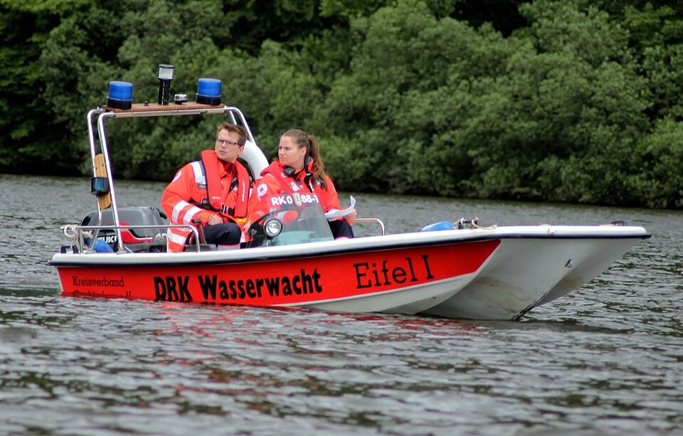 Das dachte sich wohl auch das Deutsche Rote Kreuz (DRK) im Kreis Euskirchen bei einer gemeinsamen Übung von Wasserwacht und Rettungshundestaffel am und auf dem Kronenburger See. Bei einer Feier, so die Grundvoraussetzung der Übung, zieht ein Unwetter auf. Blitze schlagen auf dem Gelände ein. Kinder und Jugendliche fliehen in Panik in alle Himmelsrichtungen und gelten als vermisst. Die speziell ausgebildeten Suchhunde des DRK hatten nun die Aufgabe, die Vermissten aufzuspüren. „Das Ausbringen der Hundeführer erfolgt am schnellsten über den See“, sagte Monika Artz, stellvertretende Leiterin der Rettungshundestaffel. Da kam die ebenfalls in Kall beheimatete Wasserwacht-Gruppe ins Spiel.