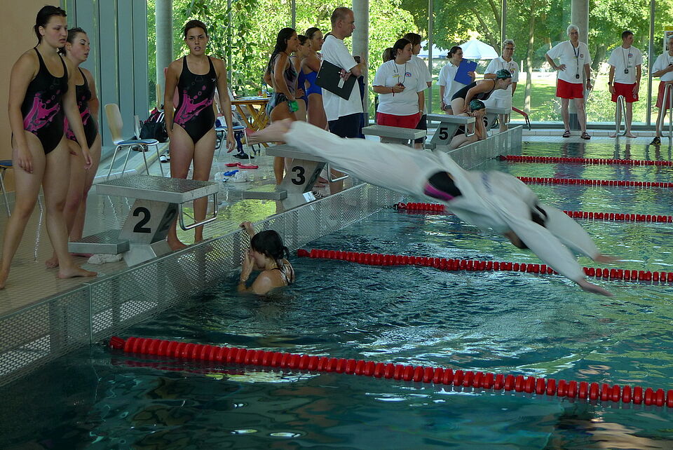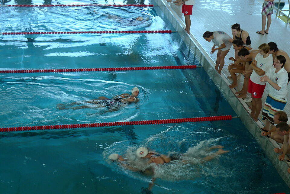 Im Schwimmbad trat man morgens gegen die Vertreter von Brandenburg, Rheinland-Pfalz, Sachsen, Thüringen an. Die packenden Staffelläufe wurden unter anderem von den Zuschauern Annemie und Karl-Heinz Schlewitz verfolgt, die in diesem Jahr seit mittlerweile 30 Jahren (!) als Schlachtenbummler die Mannschaften bei Rettungsschwimmwettbewerben begleiten. Ein Glück, denn Frau Schlewitz musste kurz vor Beginn der Kleiderstaffel noch einen Knopf an seine Hose nähen.
