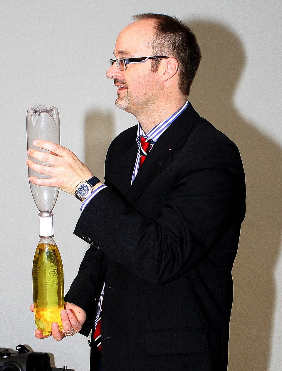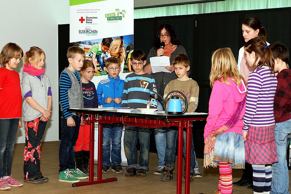 „Für das kontinuierliches Engagement der Förderung früher Bildung im Bereich Naturwissenschaften, Mathematik und Technik erhält die Katholische Grundschule Dahlem als erste Grundschule im Kreis Euskirchen die Zertifizierung zum Haus der kleinen Forscher“, verkündete Rolf Klöcker. Die zwölf engagierten Schüler der Forscher-AG ließen es sich dann auch nicht nehmen, ihren staunenden Mitschülern auf der Bühne ein Experiment zu präsentieren: Ein angezündeter Teebeutel ging plötzlich wie eine Rakete in die Luft.