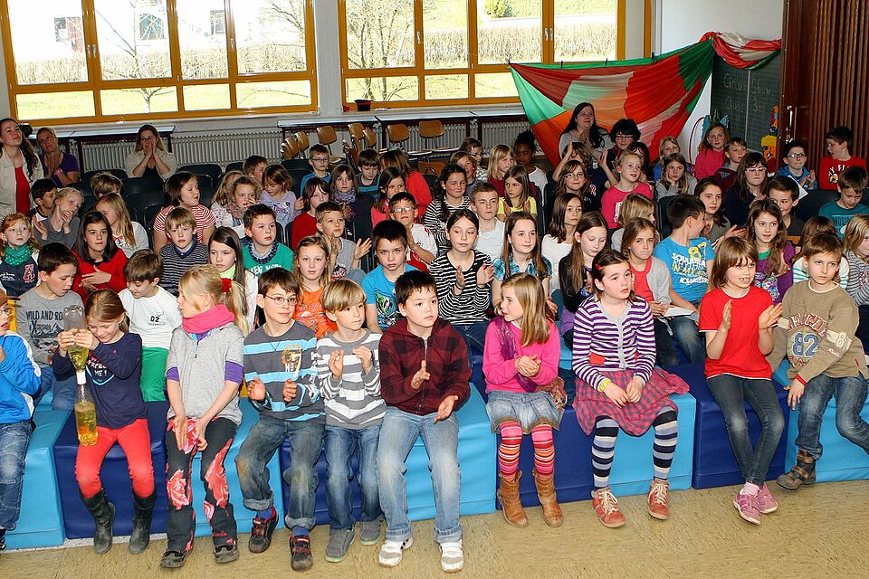 Mit dem „Schulsong“, der extra komponiert und mit einer Melodie von Uwe Reetz präsentiert wurde, endet die Feierstunde in der Aula der Dahlemer Grundschule.