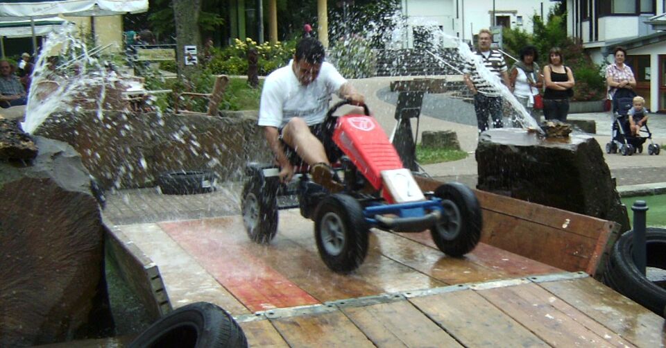 Der eng abgesteckte Parcours des "Großen Preises von Gemünd" war abwechslungsreich und machte die Rennen spannend. Über eine Holzbrücke und durch eine Art Tunnel ging es um die Springbrunnen herum, deren üblicherweise in die Höhe gehenden Wasserstrahlen man so abgelenkt hatte, dass sie den auf den Kettcars passierenden Athleten eine angenehme Abkühlung verschafften.