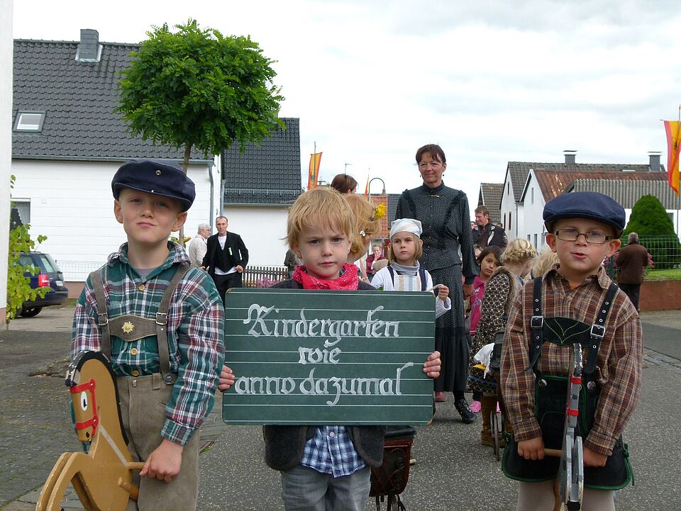 Im Anschluss der Messe begrüßte der Förderverein des Kindergartens die vielen Besucher mit frischen selbstgebackenen Reibekuchen. Ein kultureller Höhepunkt erfolgte für die Kinder, Eltern und Erziehrinnen, als der Erntedankzug durch die Straßen von Dollendorf zog. Ganz vorne durften die Kindergartenkinder den Erntedankumzug voran ziehen, gefolgt von Ziegen, Kühen, historischen Traktoren und Geräten. Für die Kinder war es ein besonderes Erlebnis von der Erzieherin an einem Seil durch die Straßen geführt zu werden. So soll es auch damals gewesen sein. Traditionell nehmen die Kinder natürlich gerne an diesem schönen Brauchtum, welches im Ort gepflegt wird, teil.