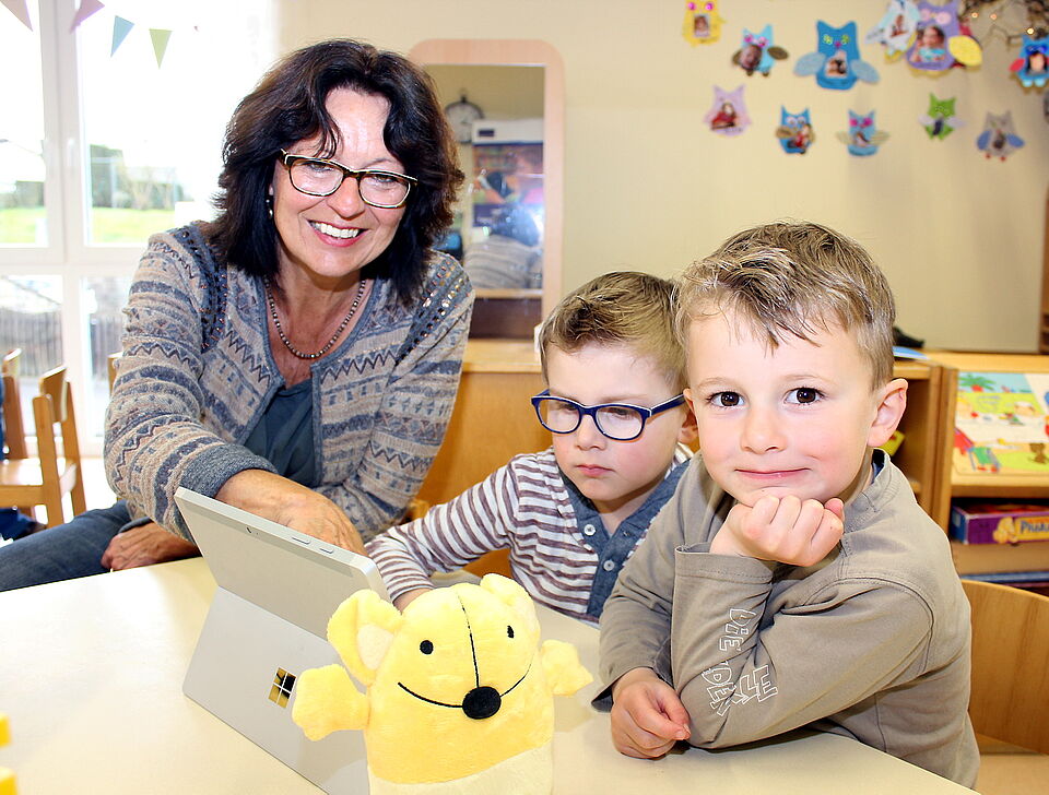 „Das ist eine Art der Sprachförderung, mit der wir hier arbeiten“, berichtete Birgit Bresgen, und ergänzte: „Jedes Kind kann sich mit seinem Namen selbst anmelden, dann läuft automatisch die Zeit.“ Nach zehn Minuten schaltet das Gerät ab, denn das ist die maximale Zeit, die die Kinder täglich am PC verbringen dürfen. Die sechsjährige Eva mag es, dass man bei den „Schlaumäusen Karten umdrehen“ kann. Aus dem Computer schallt dann ein gesprochenes Wort, dem die Kinder das entsprechenden geschrieben Wort auf dem Bildschirm zuordnen. „Wir haben da schon viel geschafft“, warf der gleichaltrige Jonas ein.