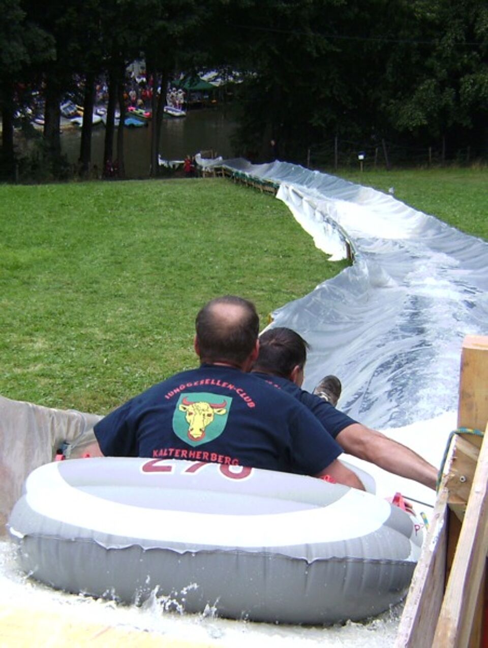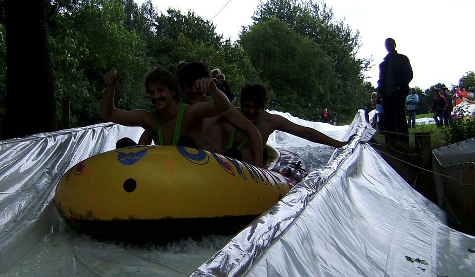 Die Teilnehmer waren aus (fast) ganz Deutschland angereist. Sogar aus Hessen und dem 160 Kilometer entfernten Velbert waren Teams angereist, um sich erst die 100 Meter lange bewässerte Planenbahn hinunter und dann ins eiskalte Wasser zu stürzen.