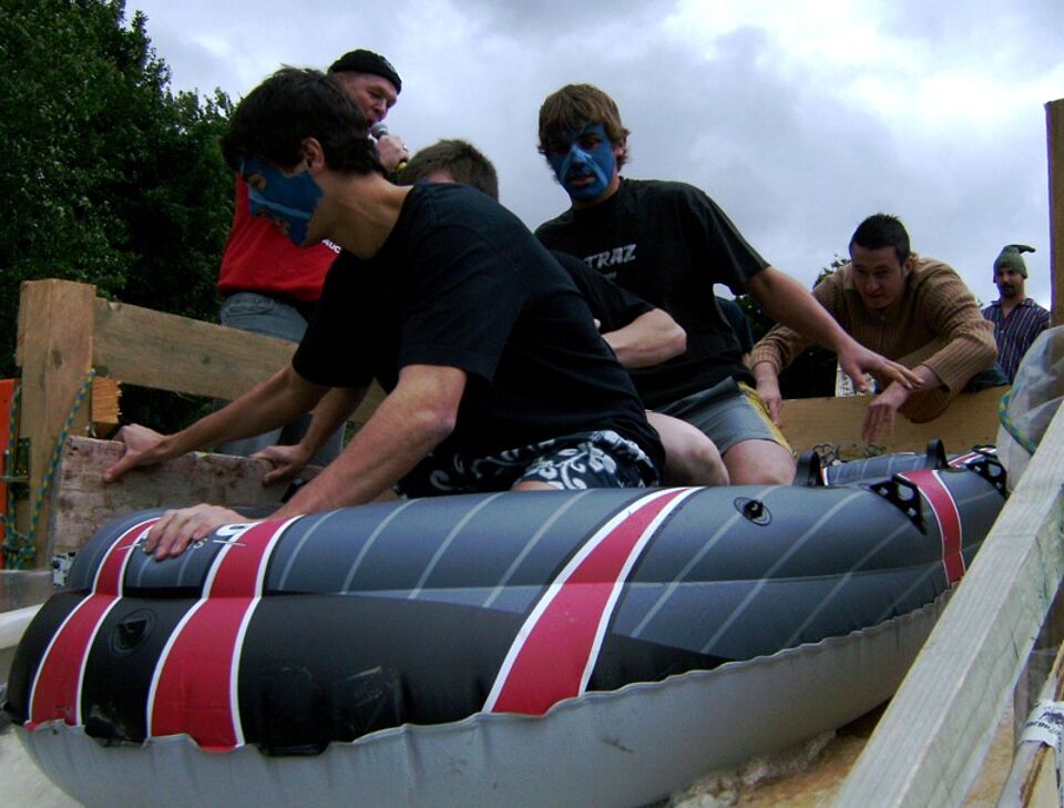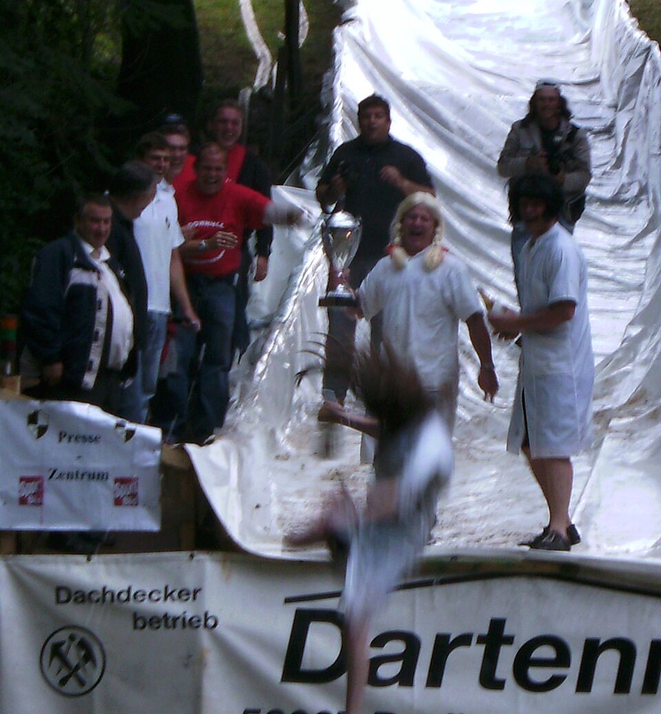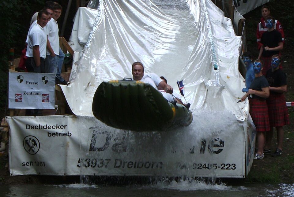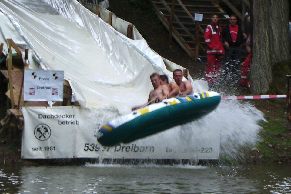 Dreiborn - Im Rampenlicht der Presse stand heute das Eifeldorf Dreiborn. Verrückte Sportwettbewerbe sind in der Eifel der neuste Hit. Vor vier Wochen noch der „Bierduathlon“ und heute das zweite Dreiborner „Down Hill Schlauchbootrennen“.