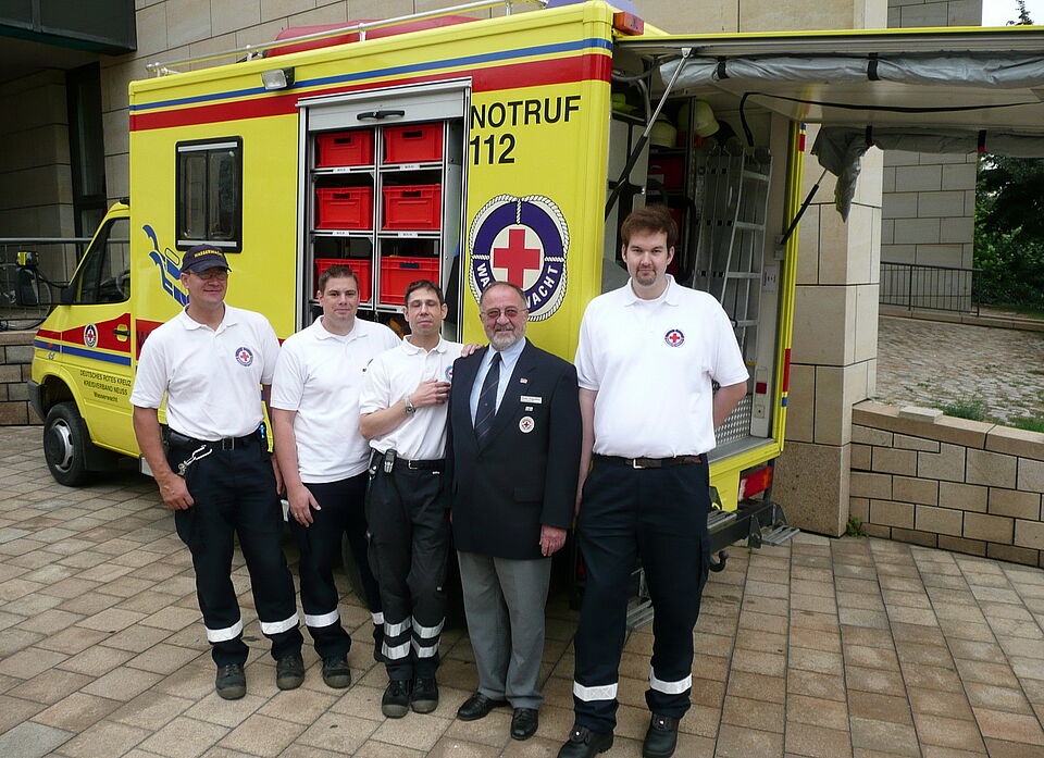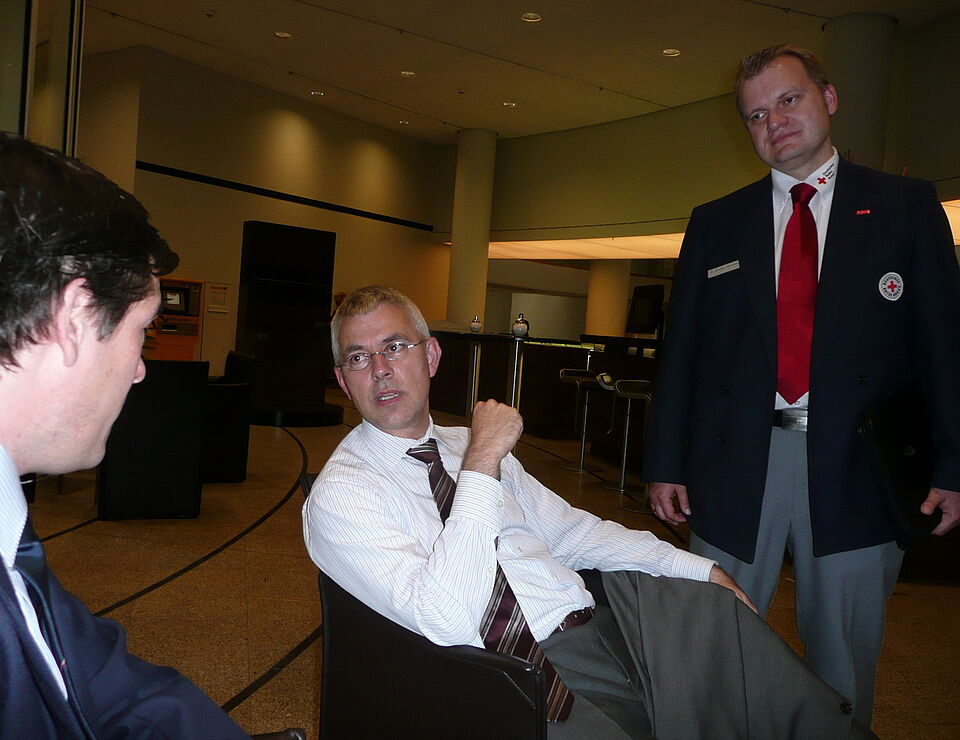Bild DRK ZR | Im Rahmen der Veranstaltung fanden die Rotkreuzler auch Gelegenheit, den Abgeordneten des Landtages ihre Arbeit zu erklären. Der sozialpolitische Sprecher der SPD Fraktion (m), Norbert Killewald, im Gespräch mit Hartmut Krabs-Höhler (r) und Robert Korell (l) vom Rotkreuz Landesverband.