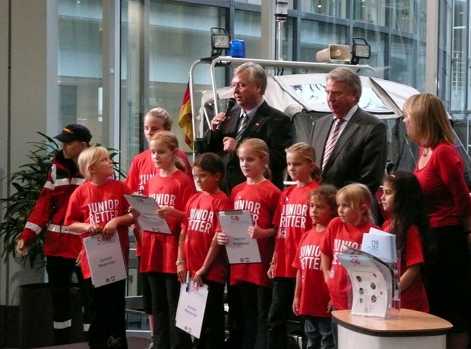 Bild DRK ZR | Dieter Schneider-Bichel und Finanzminister Dr. Helmut Linssen mit einer Gruppe von Juniorrettern der Wasserwacht.
