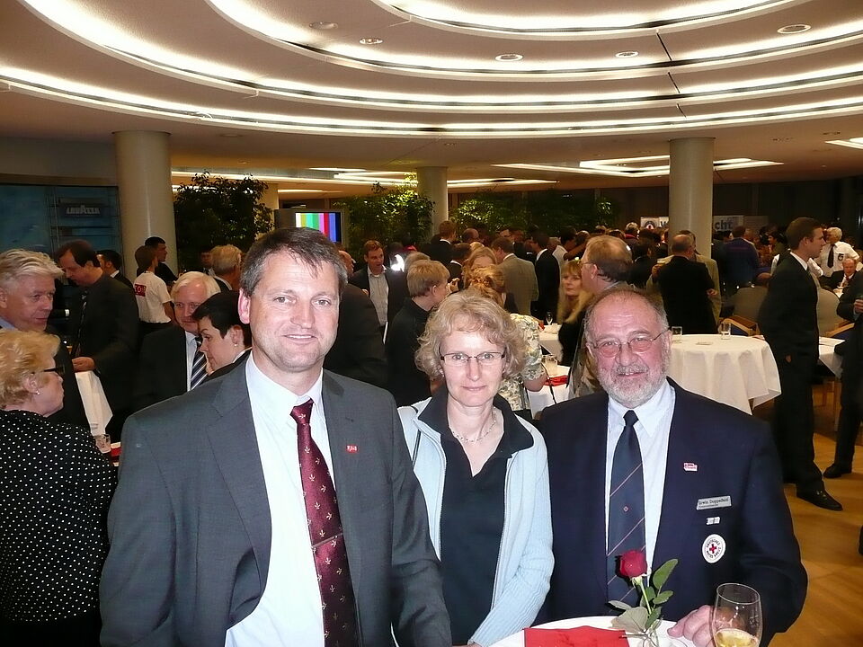 Bild DRK ZR |Horst Klöcker, seine Frau Mariele und der Rotkreuz Kreisvorsitzende Erwin Doppelfeld beim Empfang im Restaurant des Landtages.