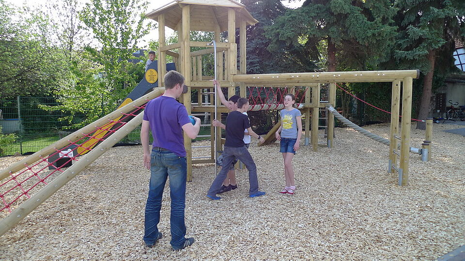 Dank der Förderung durch die Glückspirale war es möglich, im neuen Rotkreuzpark hinter dem Mehrgenerationenhaus an der Kommerner Straße eine große Baumhausspielanlage aufzubauen.