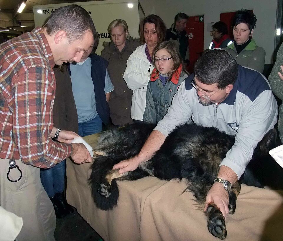 Am Vorabend richtete die Rettungshundestaffel einen Zusatzkursus „Erste Hilfe am Hund“ aus. Tierarzt Dr. Bert Hülsmann zeigte den Teilnehmern fachgerecht, wie Hundeführer und Tierliebhaber richtig in Notfallsituationen reagieren können. Der letzte Lehrgang dieser Art in diesem Jahr findet bereits am Freitag, 13. November, statt.