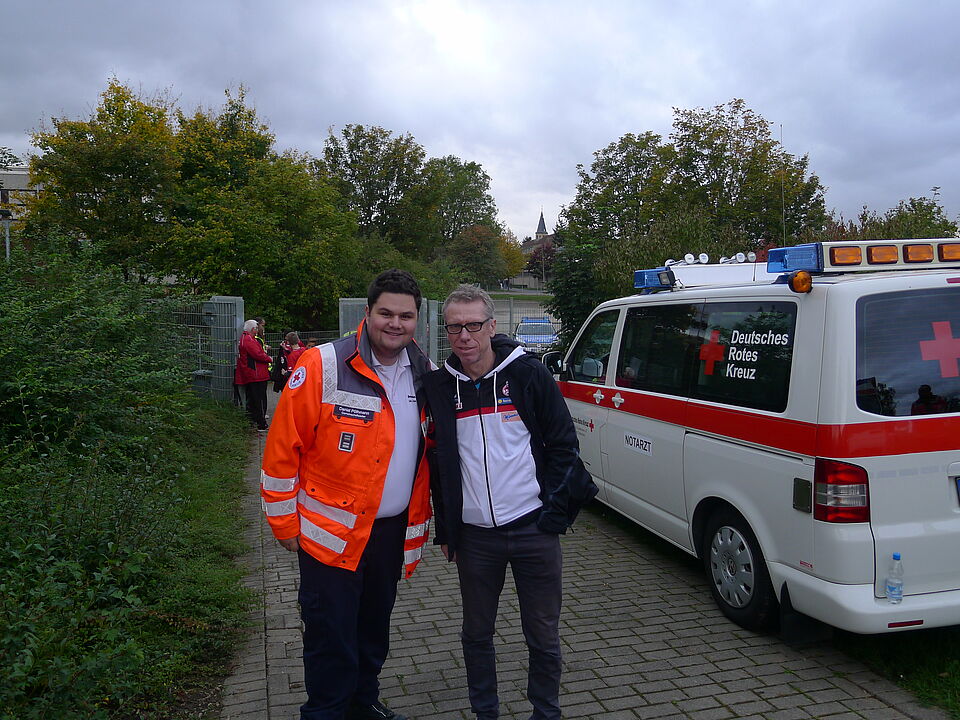 Bild DRK DP | Einsatzleiter Daniel Pöthmann organisierte den Einsatz der Rotkreuzler. Hier mit Trainer Peter Stöger