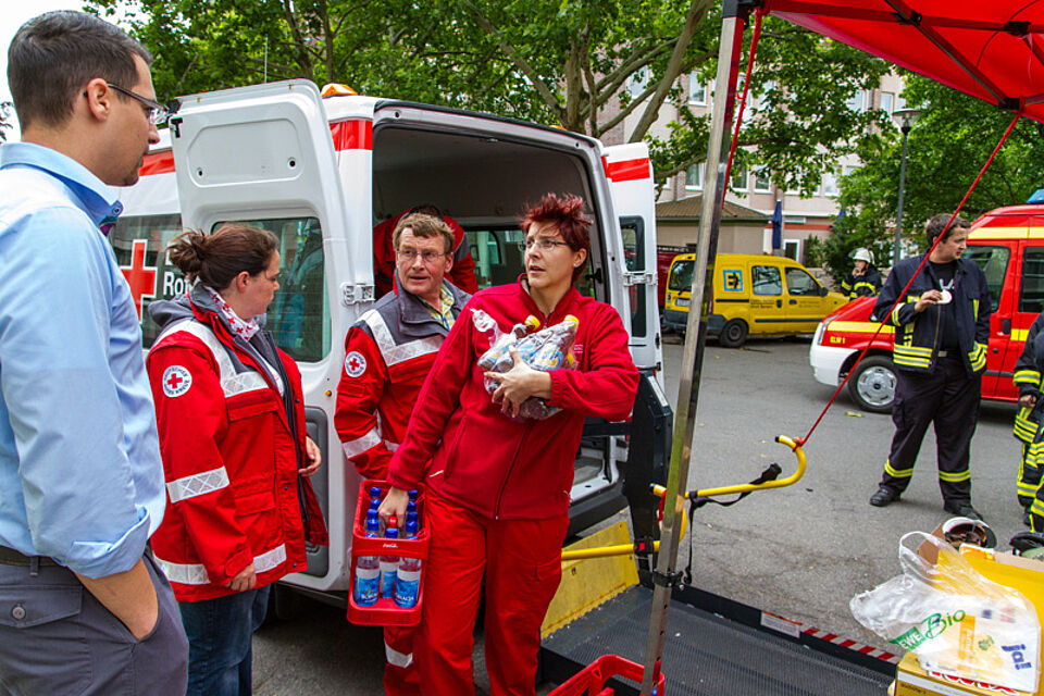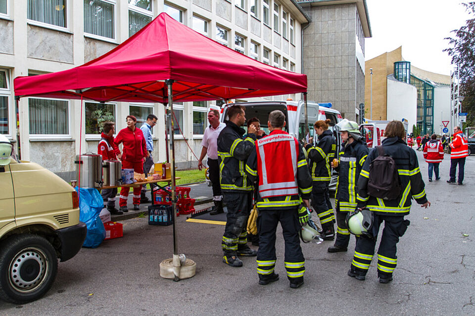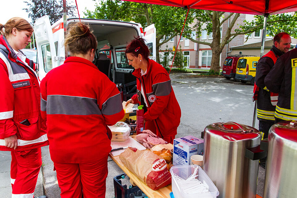 Gleich an drei Tagen hintereinander waren die ehrenamtlichen Rotkreuzler der Kreisstadt im Einsatz. Am Sonntag sorgten Sie für die Sicherheit der Teilnehmer an der Burgenfahrt. Montag und Dienstag versorgten sie die eingesetzten Kräfte der Feuerwehr bei den beiden Bränden auf der Kölner Straße.