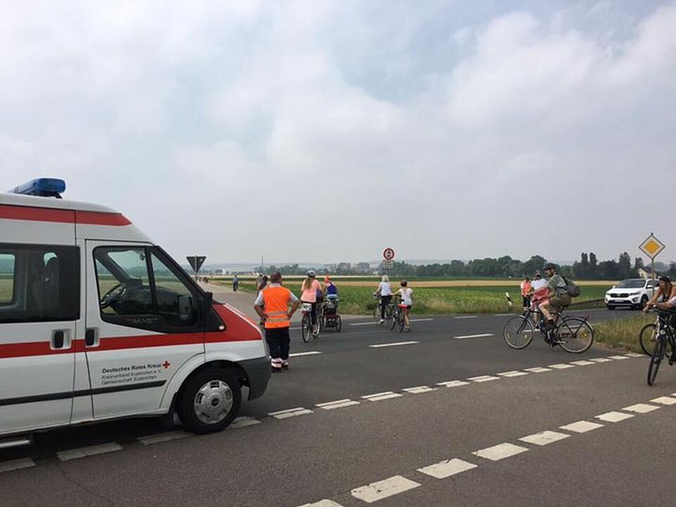 Das Rote Kreuz aus Euskirchen durfte natürlich nicht fehlen und stand für die Sicherheit der Radfahrer mit einem Rettungswagen, einem Notarzt und dem geländefähigen Quad bereit. Zusätzlich wurden ausgewählte Kreuzungen durch uns abgesichert um den Radfahrern ein gefahrloses Überqueren zu ermöglichen!