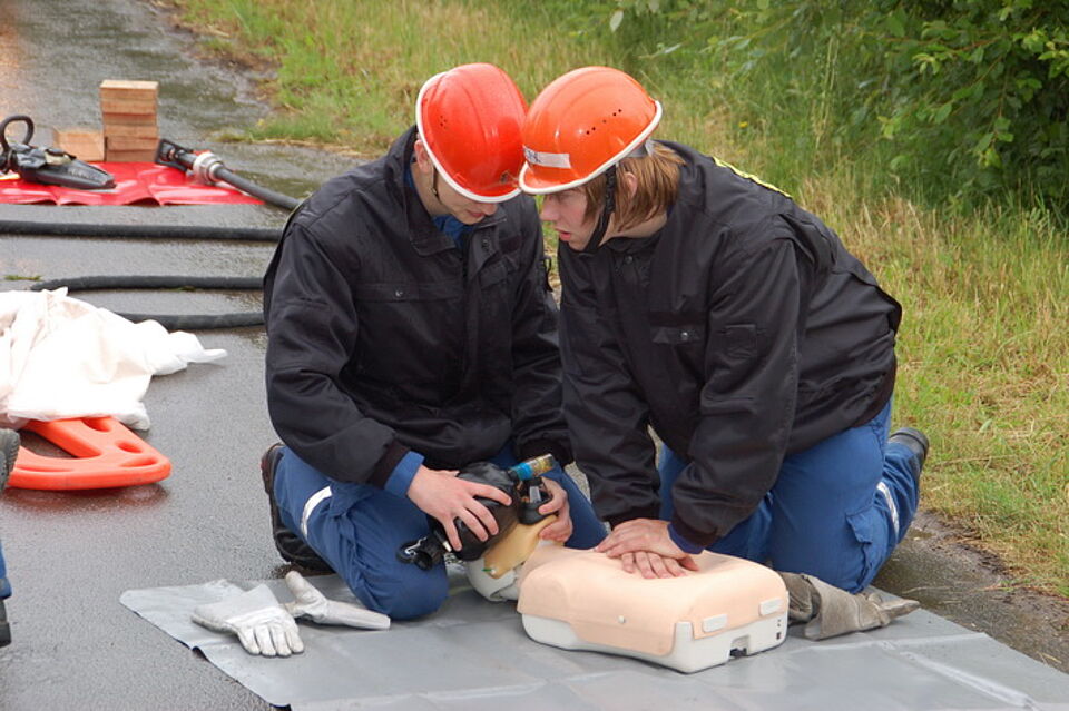 Bild WA |Da alle Rettungsdienstkräfte in der Verletztenversorgung eingebunden sind, reanimieren 2 Feuerwehrkräfte die leblose Person. Eines der Ziele des BF-Tages: Rettung Hand in Hand organisationsübergreifend.