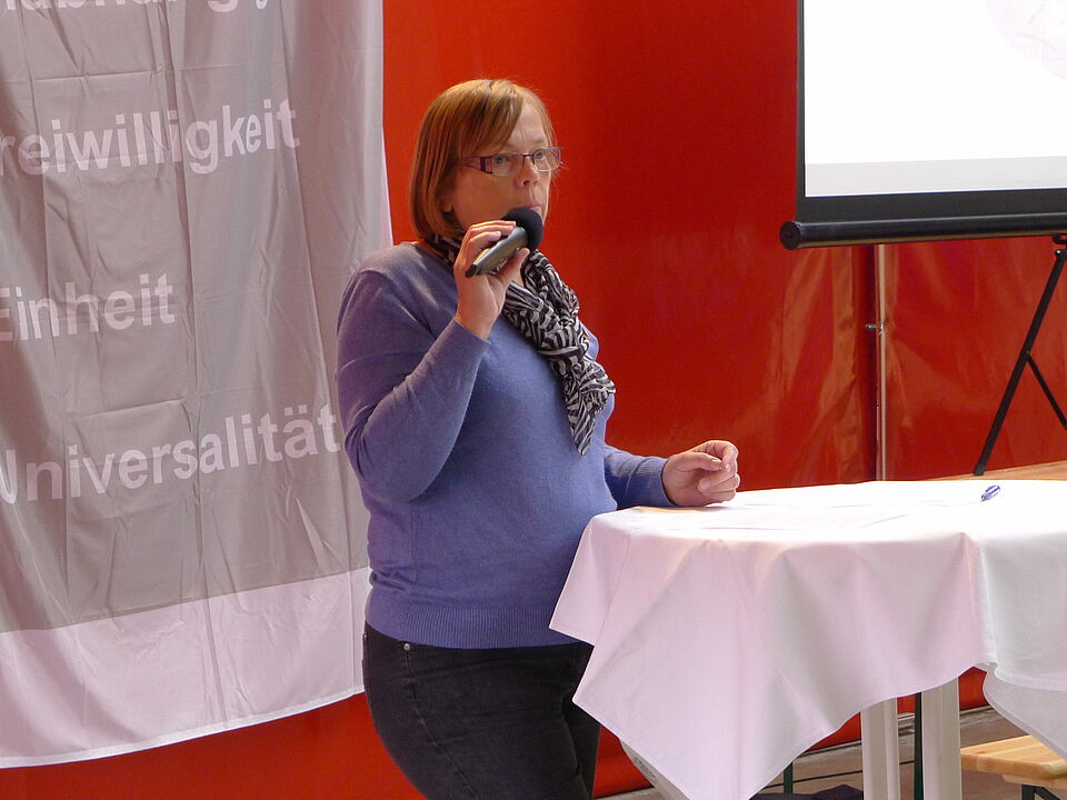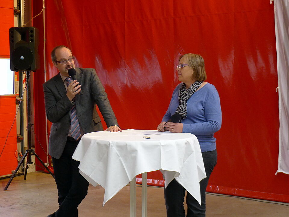 In der umfunktionierten Fahrzeughalle des Rotkreuz-Zentrums fanden sich heute zahlreiche Angestellte zur diesjährigen Betriebsversammlung ein. Beate Kruse, Vorsitzende des Betriebsrats, führte durch die Veranstaltung.