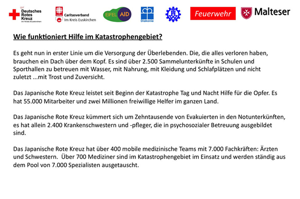 Erst eine Woche zuvor hatte das Rote Kreuz eine breit angelegte Spendenaktion ins Leben gerufen, an der sich die im Kreis Euskirchen vertretenen Hilfsorganisationen beteiligen. „Hier ist gegeben, dass das Geld auch da ankommt, wo es gebraucht wird“, betonte Erwin Doppelfeld die Effizienz des gemeinschaftlichen Engagements.