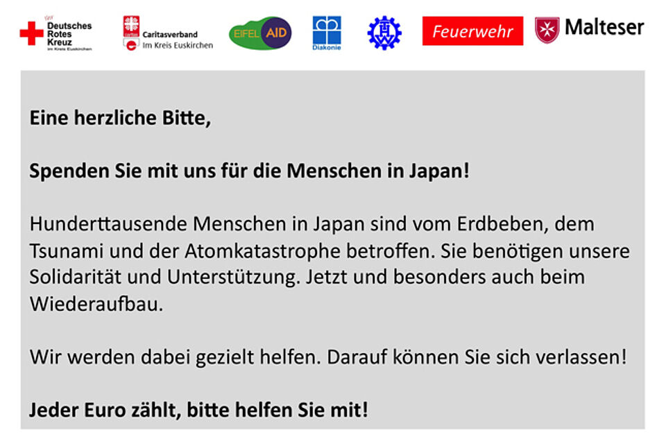 Schulleiterin Dreiseidler berichtete, dass sie die Schüler zunächst zwei Tage lang habe „ausbremsen“ müssen, bis klar war, dass Spenden für Japan gesammelt würden. „Auch eine so hochtechnisierte Industrienation wie Japan ist auf Unterstützung angewiesen“, sagte sie.