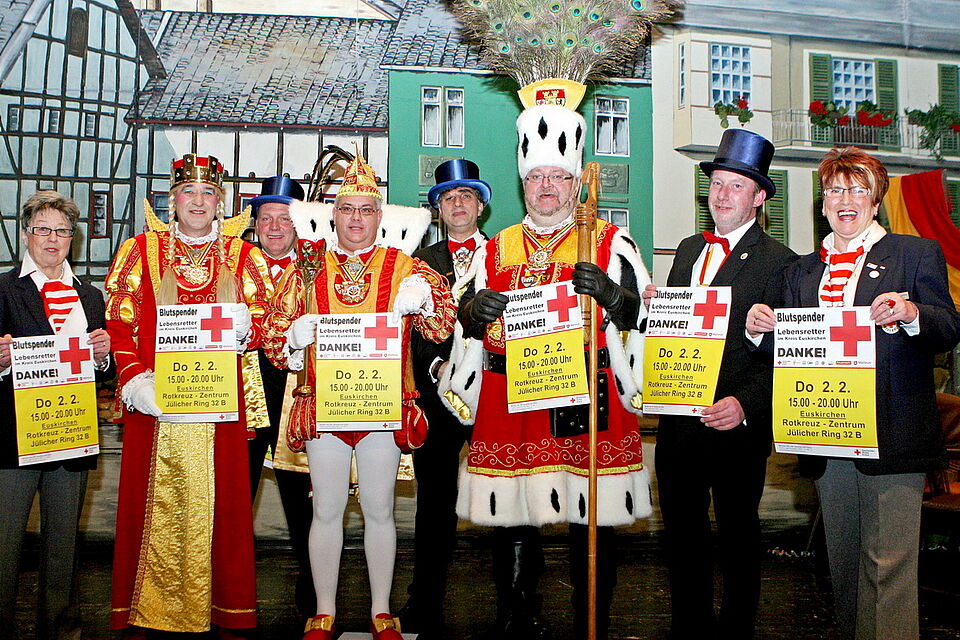 Das Euskirchener Dreigestirn geht dabei, wie die Jecken des Festausschusses Euskirchener Karneval (Feuka) in jedem Jahr, mit gutem Beispiel voran. Jungfrau Roberta (Robert Schumacher), Prinz Hajo II. (Hans-Josef Schneider) und Bauer Bernd (Kolvenbach) rufen gemeinsam mit dem Roten Kreuz im Kreis Euskirchen alle Narren- und nicht nur die - auf, sich an der Blutspende im Rotkreuz-Zentrum (hinter der Euskirchener Kreisverwaltung) zu beteiligen.