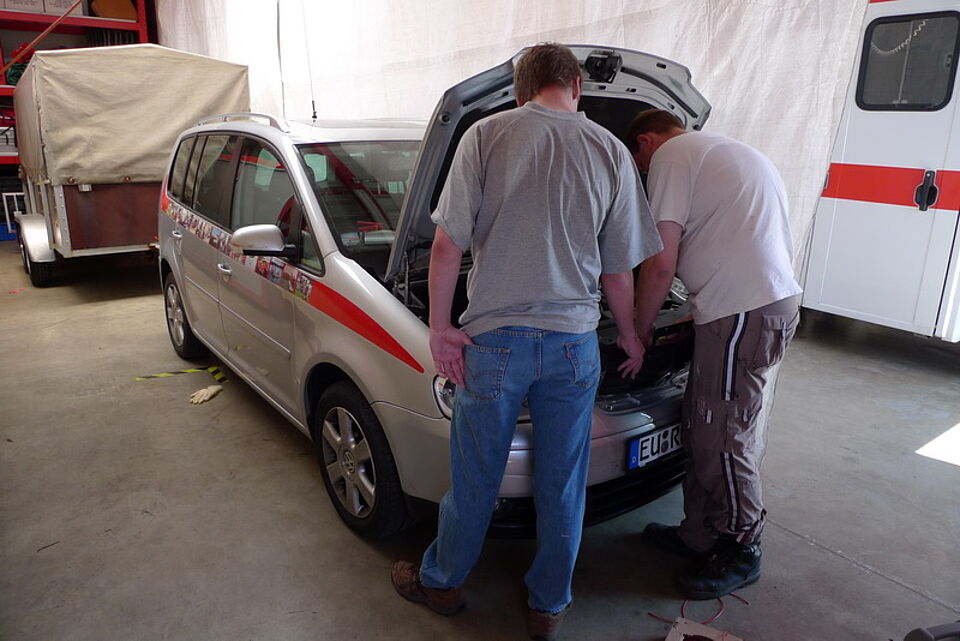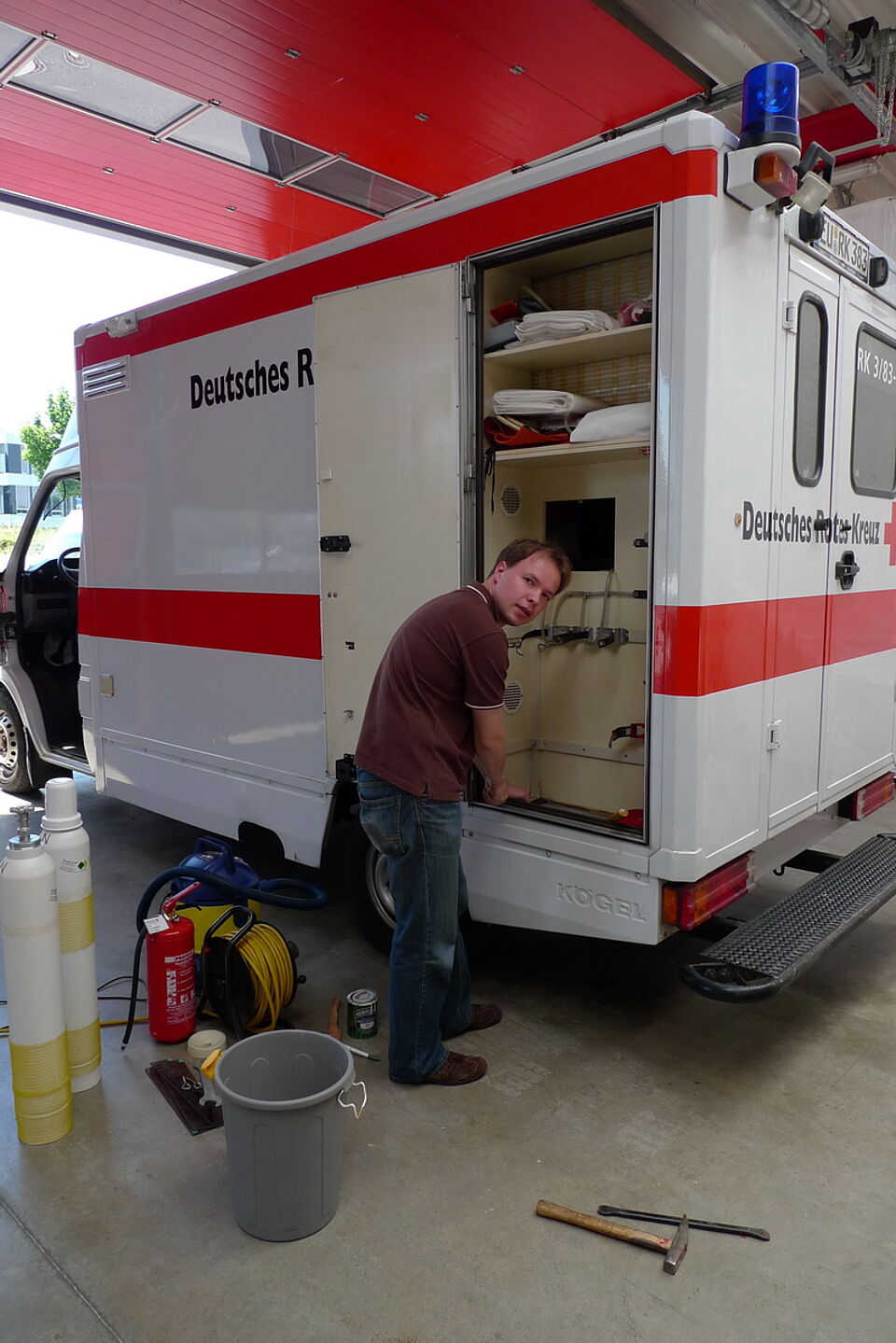 So werden zum Beispiel kleinere Reperaturen und Umbauten an Einsatzfahrzeugen durchgeführt, der mobile Bergwachtstützpunkt restauriert oder auch Schweissarbeiten erledigt. Für all das hat das Rote Kreuz seine "Fachleute", die diese Arbeiten im Rahmen ihrer Berufsausbildung erlernt oder einfach nur Spaß daran haben.
